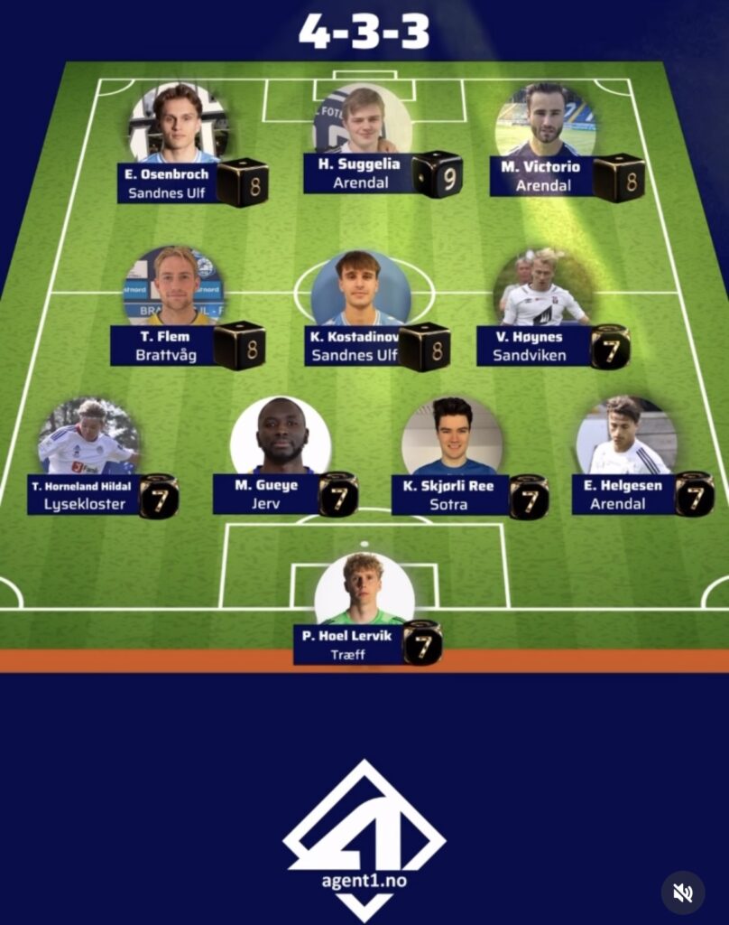Peder Hoel Lervik, Træff 7 Træffs beste spiller i høst. Banens beste og en direkte årsak til at Træff får med seg ett poeng. Solid skuddstopper med veldig fin fot. Eivind Helgesen, Arendal 7 Høyrebacken scorer 3-0 og har assist til 9-0(!). Spiller en solid kamp ellers med full kontroll på sin side og massevis av offensive bidrag. Kristian Skjørli Ree, Sotra 7 Scorer 0-1 på en nydelig heading. Rydder unna mye i duellene langs bakken og i lufta. Flink til å sette i gang spillet både med pasninger og passeringer.   Mansour Gueye, Jerv 7 Banens beste i en merkelig kamp mot Pors der Jerv er fullstendig overlegne i første omgang og Gueye scorer på en fin lobb. Gueye er god i duellspillet, men Pors kjemper seg tilbake til 2-2.  Thorstein Horneland Hildal, Lysekloster 7 Den offensive backen gjør en solid kamp hele veien med løpskraft og duellstyrke. Scorer et mål. Vebjørn Høynes, Sandviken 7 Kommer med på Rundens Lag mest på grunn av grovjobben. Løper ekstremt mye, klinker til i duellene og går foran som en signalspiller da Sandviken snur til 2-1 mot Sotra.   Kaloyan Kostadinov, Sandnes Ulf 8 Kjent for sin teknikk, men stanger inn det forløsende ledermålet etter en corner. Styrer spillet fra sin midtbaneposisjon og dikterer tempoet. Tobias Flem, Brattvåg 8 Leverer en svært solid prestasjon i Brattvågs snuoperasjon borte mot Notodden. Setter inn to helt avgjørende mål etter dype løp i boks. Få feil med ball og solid defensivt. Marcus Victorio, Arendal 8 Nydelige assists i form av presise innlegg på 1-0 og 4-0. Involvert i det meste som Arendal gjør offensivt i første omgang. Konstant trussel. Av etter 55.   Håkon Suggelia, Arendal 9 På Rundens Lag sist som stopper, og med hat-trick i første omgang som spiss mot Fløy må han selvfølgelig med igjen. Utnytter svak markering og header inn 1-0, 2-0 og 4-0. Flink som oppspillspunkt og bøy opp til dans på Arendals bursdag.    Endre Osenbroch, Sandnes Ulf 8 Klippekort på Rundens Lag. Best av samtlige spillere på Agent1-børsen. Involvert i det meste mot Vard Haugesund og scorer selv 3-0.  #scouting #footballagent #postnord #norskfotball