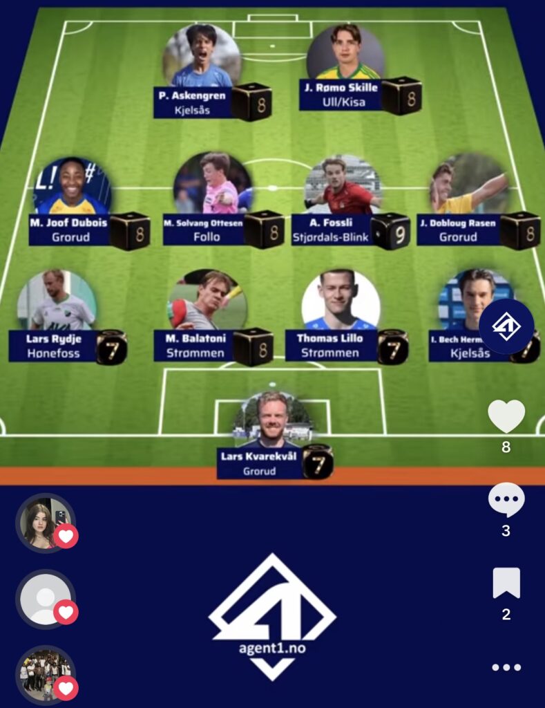 RUNDENS LAG (23) POSTNORD AVDELING 2 4-4-2 Lars Kvarekvål, Grorud 7 Holder nullen tross en travel første omgang hvor Eidsvold Turn produserer flere sjanser. Er trygg resten av kampen med god timing i feltarbeidet og feilfri distribuering. Imre Bech Hermansen, Kjelsås 7 Solid kamp på høyrebacken for Kjelsås som fortsatt har en teoretisk mulighet til å nå playoff. Assist på 1-0, solid og mange pluss-involveringer. Thomas Lillo, Strømmen 7 Solid kamp av midtstopperen. Scorer også sesongens fjerde mål for et Strømmen-lag som i praksis er klare for OBOS-ligaen. Maximilian Balatoni, Strømmen 8 Forsvarssjefen! Scorer også 2-0 like før pause, et mål det oser vinnervilje av. Lite trekk for filming og gult kort i første omgang. Lars Rydje, Hønefoss 7 Venstrebacken er nok en gang solid i det meste han foretar seg. En bauta bak og ikke minst bidrar han fremover, blant annet med en målgivende. Jonas Dobloug Rasen, Grorud 8 Setter inn 2-0-målet som gir energi inn i pausen. Er ellers en håndfull for Eidsvold Turn-forsvaret, ofte ved å dra av en mann eller to for å beholde ballen i laget. Andreas Fossli, Stjørdals-Blink 9 Leverer en strålende prestasjon og hat-trick mot Alta. Kombinerer fart, teknikk og kliniske avslutninger med begge bein. En praktkamp av den offensive midtbanespilleren. Markus Solvang Ottesen, Follo 8 Rask og driblesterk kant som skaper masse sjanser for Follo. Han viser igjen sin offensive kraft med et flott mål i kampen mot Rana. Musa Joof Dubois, Grorud 8 Kunne fort hatt 2-3 mål i denne kampen. Grorud har enorm kontringsstyrke, en fase i spillet hvor Dubois er den mest sentrale brikken. Mål og assist gjør han til BB. Kan han føre Grorud til playoff? Jakob Rømo Skille, Ull/Kisa 8 Henter nesten inn 0-3 til 3-3 på egenhånd med hat-trick på 21 minutter i 2. omgang!. Spissen gir seg aldri og får fortjent uttelling for strevet.  Patrick Askengren, Kjelsås 8 Scorer to mål, er flink til å stusse høye baller videre, og jobber hardt særlig på slutten av kampen da Kjelsås snur fra 1-2 til 3-2. Askengren er effektiv og i kanonform. #postnord #scouting #fotball #spillerbørs