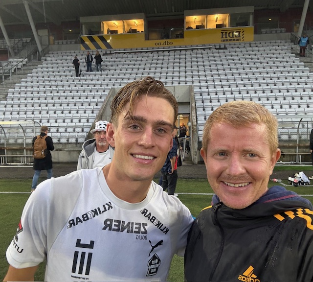 Erik Muhle etter to scoringer for Eik mot Start i NM. Her sammen med fotballagent Roy Pedersen.